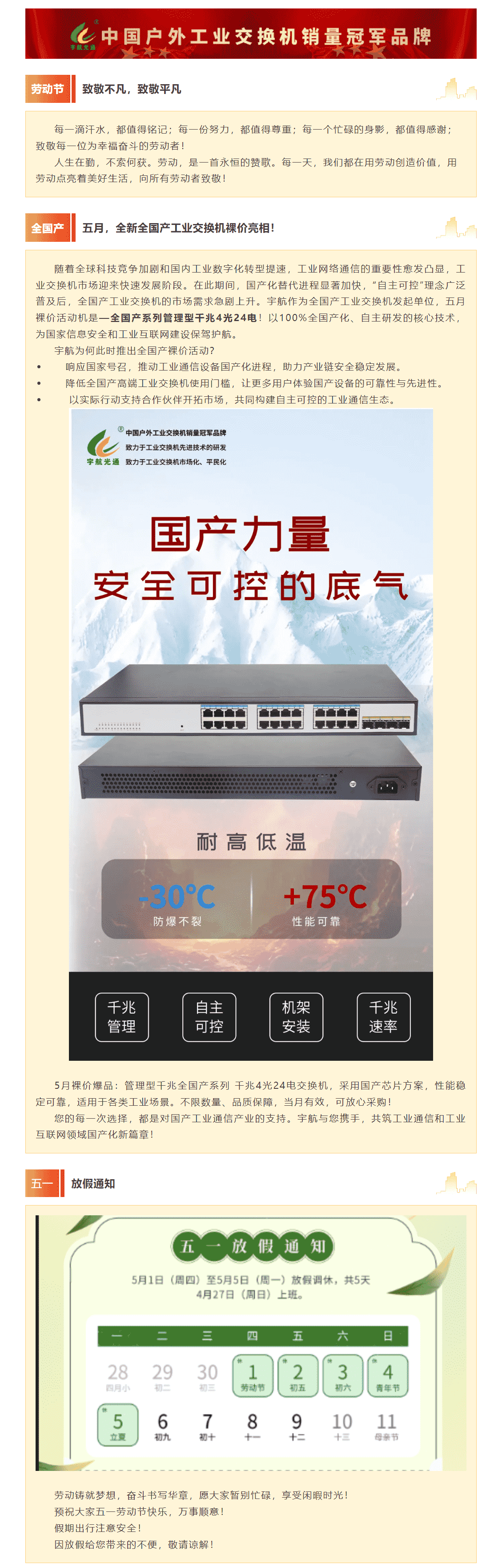 勞動(dòng)節(jié),用勞動(dòng)點(diǎn)亮美好生活!宇航全新全國(guó)產(chǎn)工業(yè)交換機(jī)五月裸價(jià)提前赴約!