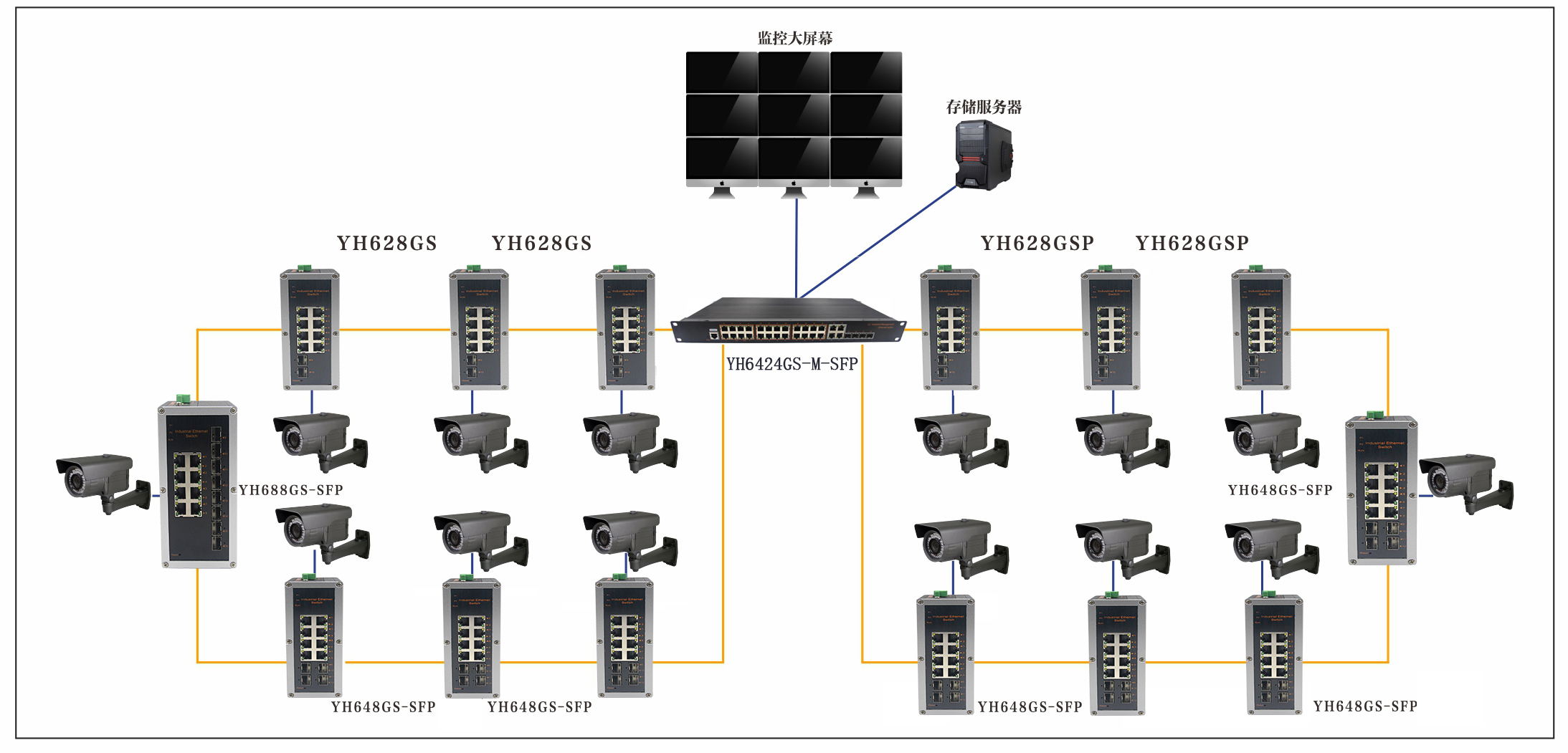 宇航道路交通檢測系統解決方案: 采用YH6424GS-M-SFP,YH688GS-SFP,YH628GSP,YH648GS-SFP系統抓拍的點全YH628GS-SFP形成環網,直接在中心房采用千兆工業交換機進行數據匯聚。保障各個監控點監控到位,與正常通信提高網絡數據傳輸的高效性。